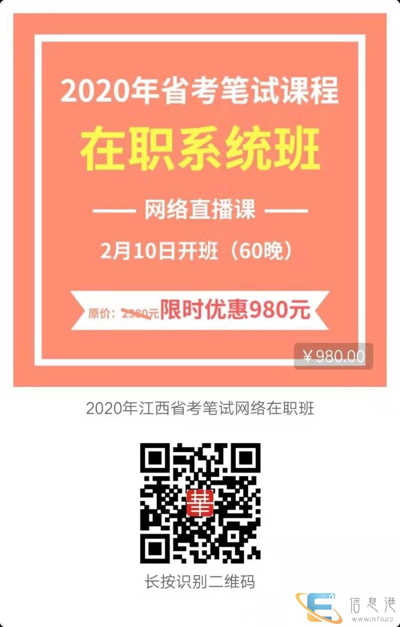 2020年江西公务员考试公告还没有发布,但是近几年来江西都参加了多省联考,所以考试时间比较固定,大约可以推测出是在2020年3月份开始报名,4月中下旬进行笔试。很多考生是 次接触公务员考试,对于公务员考试招考的时间和流程比较陌生,本文公考资讯网将2019年江西公务员考试的时间安排整理出来,考生可以作为参考,便于合理安排接下来的笔试备考工作。2019年江西公务员考试日程安排(来源于2019年江西华公教育 )(一)网上报名:3月20日9:00至3月29日17:00;(二)网上缴费:截止到4月1日17:00;(三)打印准考证:4月15日至19日;(四)公共科目笔试:4月20日;(五)公安专业科目加试:4月21日;(六)公布笔试成绩:5月20日;(七)公布 批入闱名单和调剂公告:5月下旬(八)网上调剂、公布调剂入闱名单:5月底至6月初(九)资格审查、面试、体测、体检:6月~7月;(十)考察、公示和录用:7月~9月。